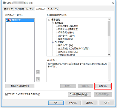 - 現在の印刷設定に適用されているお気に入りの設定は削除できません。[お気に入り一覧]から他のお気に入りを選んで[お気に入りの適用]をクリックし、他のお気に入りの設定を適用してから削除を行ってください。