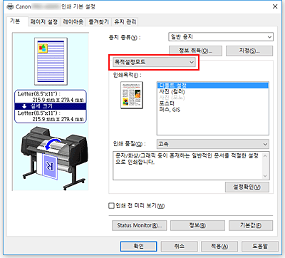 풀다운 메뉴에서 목적설정모드(Easy Settings)를 선택한 다음 인쇄목적(Print Target) 목록에서 목적에 맞는 설정을 선택합니다.