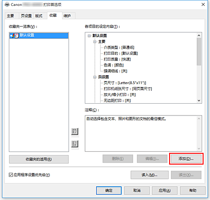 可以将常用的打印设置注册到收藏。 不需要的打印配置文件可以随时删除。