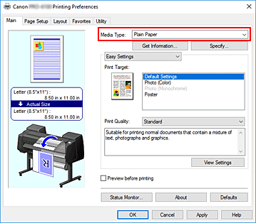 If Roll Paper (Auto) is selected for the paper source, it will remain as Roll Paper (Auto) even if you get the paper information from the printer. - For instructions on changing the media type from the printer's operation panel, see "Changing the Type of Paper."