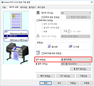 급지 방법(Paper Source)에서 롤 용지를 선택한 경우 롤 용지 너비(Roll Paper Width)를 프린터에 로드된 롤 용지의 너비로 설정합니다.