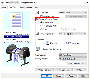 • If you are performing enlarged/reduced printing when Automatically switch paper sources (paper size priority) is enabled, Fit Roll Paper Width is selected for Enlarged/Reduced Printing on the Page Setup tab, and Roll Paper (Auto) is selected for Paper Source, Roll 1 (upper level roll paper) is always used for printing.