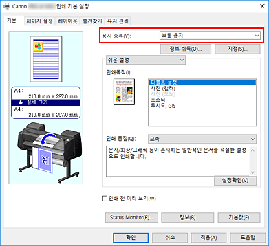 기본(Main) 탭의 용지 종류(Media Type) 목록에서 프린터에 로드된 용지의 종류를 선택합니다.