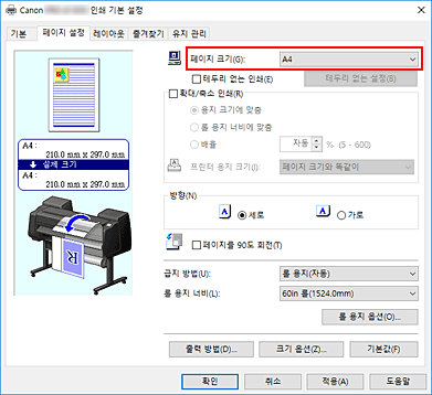 페이지 설정(Page Setup) 탭의 페이지 크기(Page Size) 목록에서 어플리케이션 소프트웨어를 사용하여 만든 문서와 같은 크기를 선택합니다.
