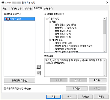 즐겨찾기(Favorites) 탭에서는 자주 사용하는 인쇄 설정을 즐겨찾기로 등록할 수 있습니다.