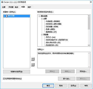 应用程序软件中的设置将优于打印机驱动程序上设置的收藏设置。