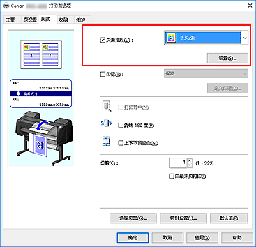 在版式选项卡上,选中页面布局复选框,然后从下拉菜单中选择2 页/张、4 页/张、6 页/张、8 页/张、9 页/张或16 页/张。