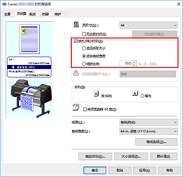 如果已在应用程序软件中设置可选尺寸,则在页尺寸的自定义纸张中选择自定义大小,然后在显示的对话框中指定尺寸。选择卷纸宽度