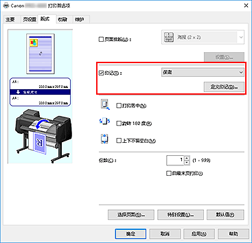 版式选项卡上,选中印记复选框,然后从列表中选择要使用的印记。