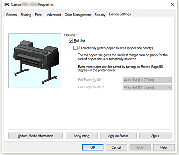 - Be sure to click Acquire Status from the Device Settings tab to get information on the roll paper width. You may not be able to print correctly if the roll paper width is not correctly set.