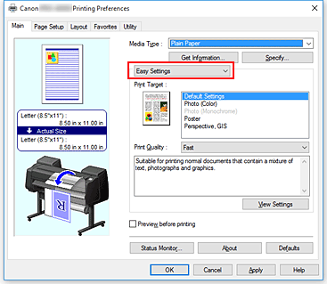 From the pull-down menu, select Easy Settings, and then select the setting that matches your purpose from the Print Target list.
