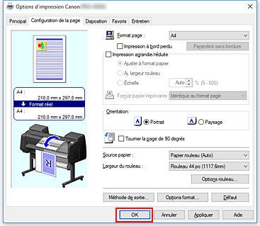 Dans la liste Format page de l'onglet Configuration de la page, sélectionnez le même format que celui du document créé avec le logiciel d'application.