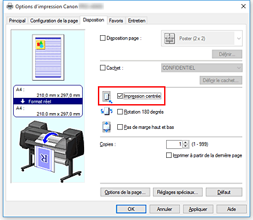 Pour positionner le document source au centre du papier de découpe et l'imprimer, ou imprimer avec des marges égales à droite et à gauche par rapport à la largeur du rouleau, utilisez la fonction Impression centrée.