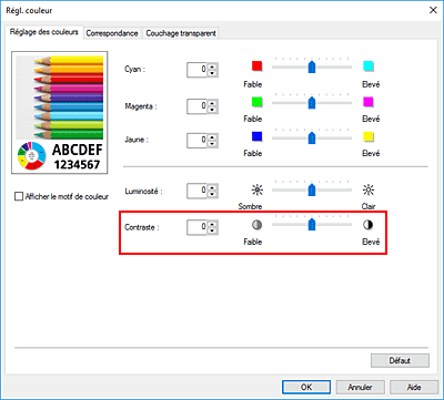 Dans l'onglet Réglage des couleurs, déplacez le curseur Contraste vers la droite pour augmenter le contraste et vers la gauche pour le réduire.