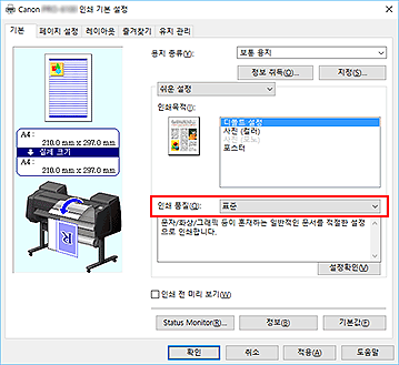 - 프린터 드라이버의 용지 설정이 프린터에 등록된 용지 정보와 다른 경우 프린터 조작판에 오류 메시지가 나타날 수 있습니다. 인쇄를 실행할 수는 있지만 올바른 인쇄 결과를 얻지 못할 수 있습니다.