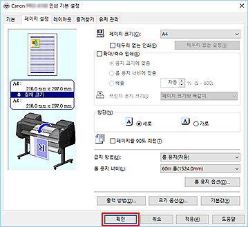참고- 프린터에 용지 종류와 출력 용지 크기가 설정되지 않은 경우, 확인(OK)은 회색으로 표시되고 클릭할 수 없습니다.
