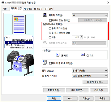 확대/축소 인쇄(Enlarged/Reduced Printing) 확인란을 선택하고 롤 용지 너비에 맞춤(Fit Roll Paper Width)을 선택합니다.