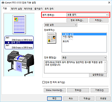 기본(Main) 탭의 용지 종류(Media Type) 목록에서 프린터에 로드된 용지의 종류를 선택합니다.