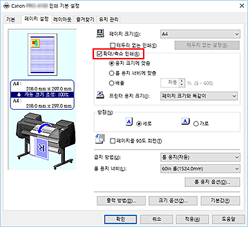 - 원본을 작성하는 데 사용한 어플리케이션 소프트웨어에 배율 인쇄 기능이 있으면 어플리케이션 소프트웨어에서 설정을 구성하십시오. 프린터 드라이버에서 같은 설정을 구성할 필요는 없습니다.