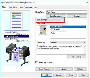 No menu suspenso, selecione Configurações fáceis (Easy Settings), depois escolha a configuração de sua preferência na lista Destino de impressão (Print Target).