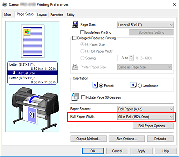 Для параметра Ширина рулона бумаги (Roll Paper Width) выберите ширину рулона бумаги, загруженного в принтер.