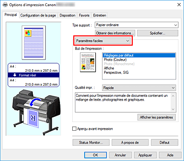 Dans le menu déroulant, sélectionnez Paramètres faciles, puis sélectionnez le paramètre correspondant à vos besoins dans la liste But de l'impression.