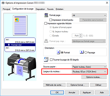 Si vous sélectionnez un papier rouleau dans Source papier, renseignez la largeur du papier rouleau chargé dans l'imprimante sous Largeur du rouleau.