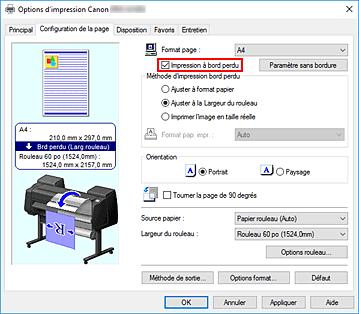 - Si vous cochez l'option Impression à bord perdu, les options Mise en page et Impression centrée de l'onglet Disposition s'afficheront grisées et vous ne pourrez pas les configurer.