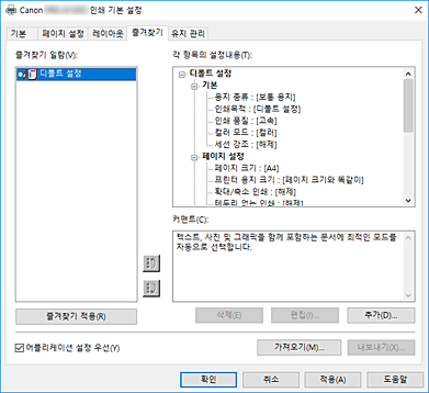 즐겨찾기(Favorites) 탭에서는 자주 사용하는 인쇄 설정을 즐겨찾기로 등록할 수 있습니다.