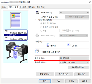 롤 용지의 인쇄 방법 선택