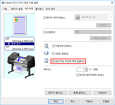 롤 용지에 인쇄하는 경우 상단 및 하단 여백을 줄여 용지를 절약할 수 있습니다.