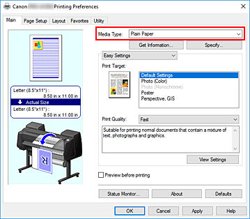 Selecione o tipo de papel da impressora na lista Tipo de Mídia (Media Type) da guia Principal (Main).