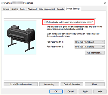 Примечание.- Если параметр Автом.переключ.источн.бумаги (приоритет размер.бумаги) (Automatically switch paper sources (paper size priority)) недоступен, обратитесь к разделу "Укажите настройки блока рулона в драйвере принтера" и установите для параметра Блок рулона (Roll Unit) в диалоговом окне Свед. об устр-ве (Device Information) значение Да (Yes).