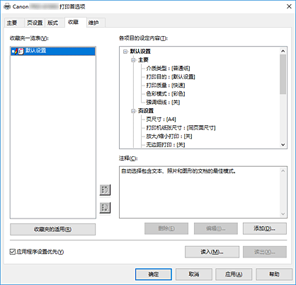 使用收藏选项卡可以将常用的打印设置注册为收藏设置。