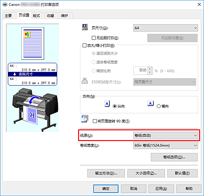 对于纸源选项卡的页设置,从卷纸(自动)、卷纸 1和卷纸 2中选择符合使用目的的设置。