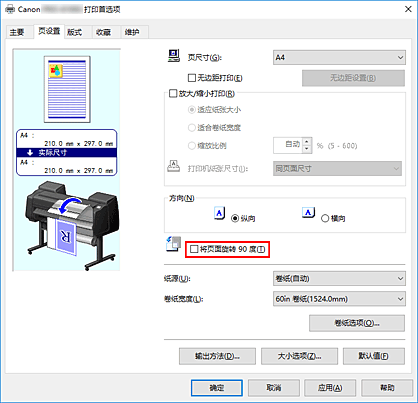 - 从页设置选项卡中选择页尺寸为纵向格式的纸张时,如果垂直方向上的长度超过在卷纸宽度中选定的宽度,则即使在将页面旋转 90 度旁添加选中标记,也不会旋转该页面。