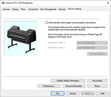 En función de esta información, se cambiarán automáticamente las opciones Unidad de rollo (Roll Unit), Cambiar automáticamente origen de papel (prioridad tamaño papel) (Automatically switch paper sources (paper size priority)) y la anchura del rollo.