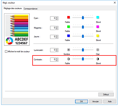 Dans l'onglet Réglage des couleurs, déplacez le curseur Contraste vers la droite pour augmenter le contraste et vers la gauche pour le réduire.