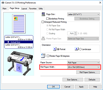 Для параметра Ширина рулона бумаги (Roll Paper Width) выберите ширину рулона бумаги, загруженного в принтер.