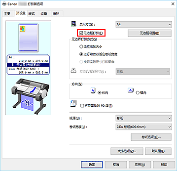- 如果在无边距打印选项旁添加选中标记,版式选项卡中的页面排版和打印居中选项将显示为灰色且无法设置。