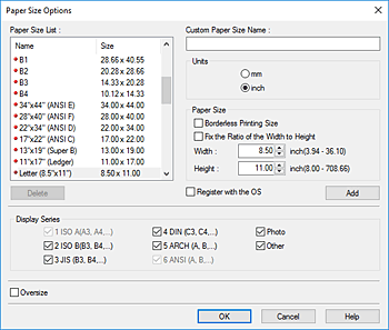 - Um ein Papierformat in Übergröße als Sonderformat festzulegen, speichern Sie das Papierformat im Dialogfeld Papiergröße-Optionen (Paper Size Options). Ein Papierformat in Übergröße kann nicht für Papierformate verwendet werden, die im DialogfeldBenutzerdefinierte Größeneinstellungen (Custom Size Settings) eingestellt wurden.