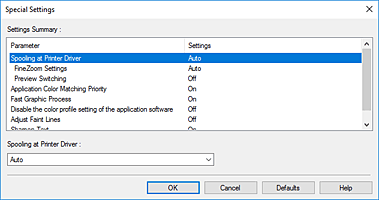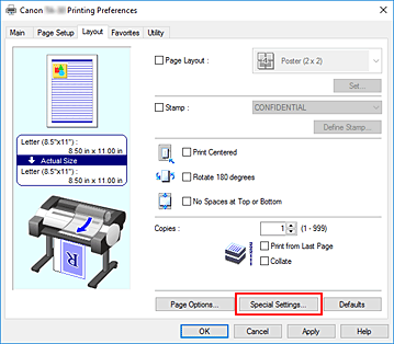 2. Auswählen von Sondereinst.... (Special Settings...) auf der Registerkarte Layout