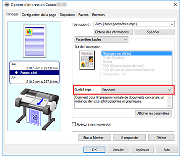 • Les paramètres de qualité d'impression qui peuvent être sélectionnés peuvent différer en fonction d'un profil d'impression.