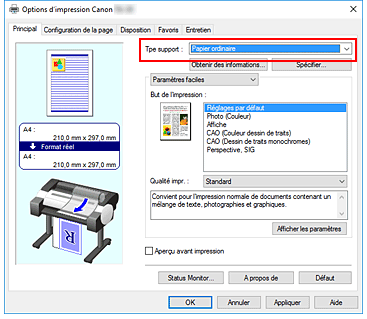Sélectionnez le type du papier chargé dans l'imprimante dans la liste Type de support de l'onglet Principal.