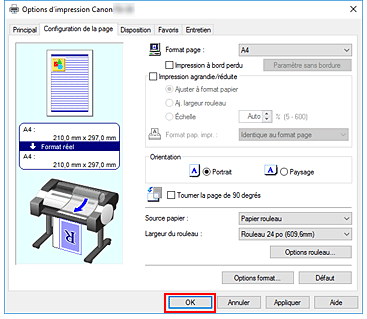 Dans la liste Format page de l'onglet Configuration de la page, sélectionnez le même format que celui du document créé avec le logiciel d'application.