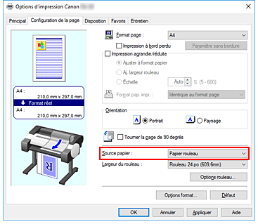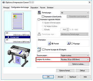 Si vous sélectionnez un papier rouleau dans Alimentation papier, renseignez la largeur du papier rouleau chargé dans l'imprimante sous Largeur du rouleau.