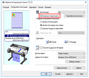• Si vous cochez l'option Impression à bord perdu, les options Mise en page et Impression centrée de l'onglet Disposition s'afficheront grisées et vous ne pourrez pas les configurer.