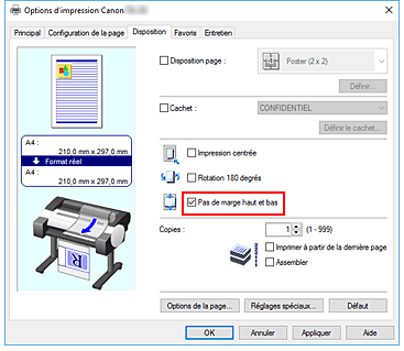 Lorsque vous imprimez sur un rouleau de papier, vous pouvez économiser du papier en réduisant les marges supérieure et inférieure lors de l'impression.
