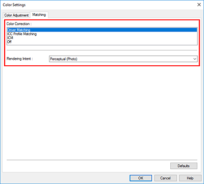 Fare clic sulla scheda Corrispondenza (Matching) e selezionare Corrispondenza driver (Driver Matching) per Correzione colore (Color Correction).