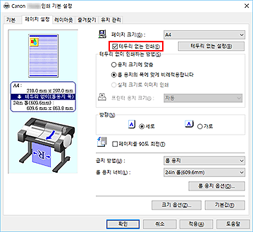 테두리 없는 인쇄(Borderless Printing) 옵션 옆의 확인란을 선택합니다.